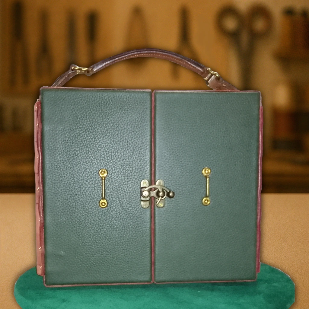 Présélya est une Composition haut de gamme réalisée en cuir tannage végétal bleu canard, avec bordures en collet rouge marbré et intérieur en velours vert.