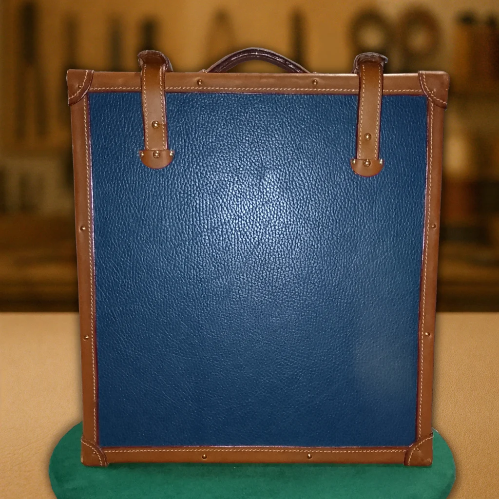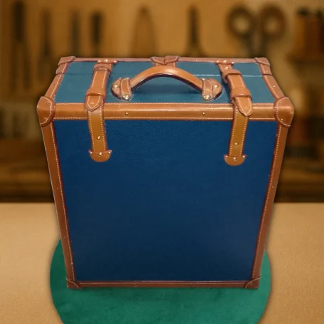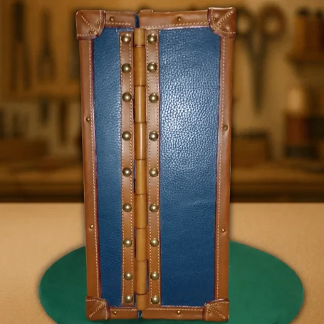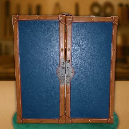 - Le coffret Vinéliane est habillé d’un cuir tannage végétal bleu canard, choisi pour sa résistance et son esthétique. Les bordures, charnières et sangles sont réalisées en collet tannage végétal marron, fixés avec des clous de tapissier en laiton poli.